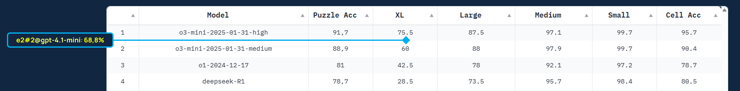 - e2-research#2 @ gpt-4.1-mini erzielt eine Lösungsrate von 68,8 % bei den XL-Puzzles,