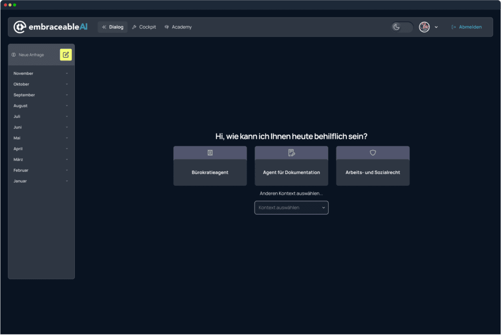 embraceableAI ist ein KI-Angebot, das zu 100% unter strategischer und operativer europäischer Kontrolle steht, und von Datenschutz bis EU AI Act alle relevanten europäischen Vorschriften und Gesetze beachtet.