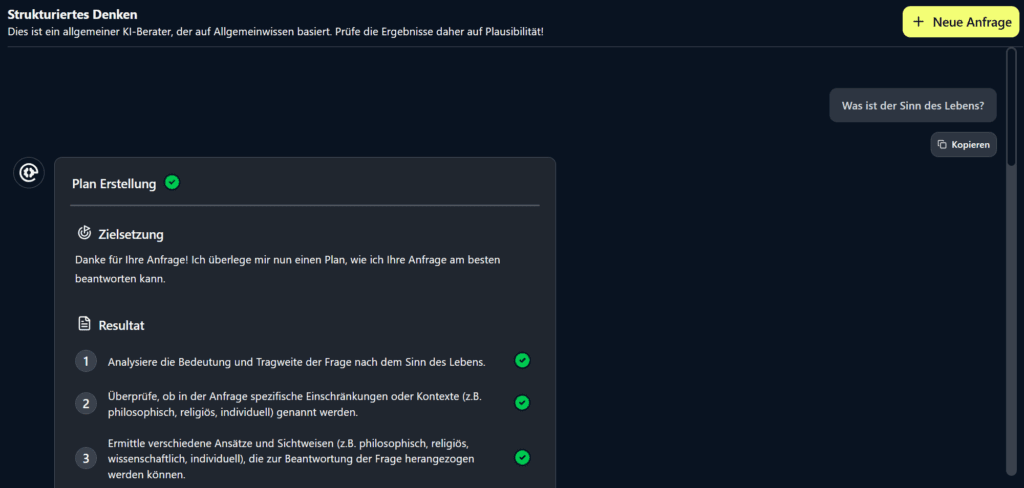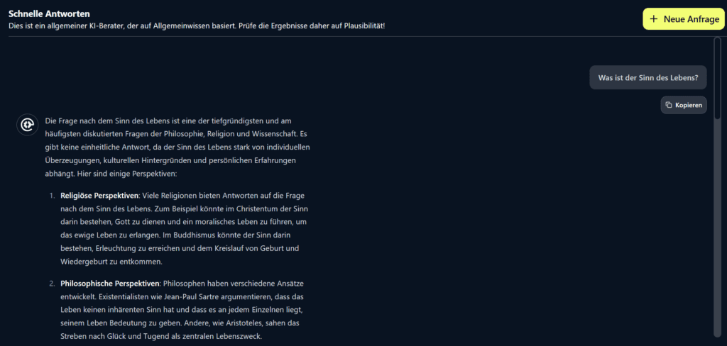 Ob kurze Fragen, kreative Ideen oder Ad-Hoc Analysen – in dem „Schnelle Antworten„-Modus erhalten Sie in wenigen Sekunden Ergebnisse auf der Basis „normaler“ KI-Sprachmodelle, ohne die zusätzlichen Schritte des Deduktiven Denkens zu durchlaufen.